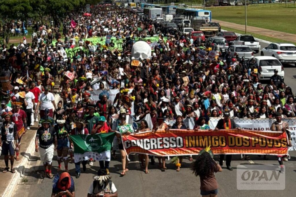Nesta terça-feira (7), milhares de indígenas de todo o Brasil participaram da marcha “Congresso inimigo dos povos: nosso futuro não está à venda”, em Brasília. O grupo partiu do Eixo Cultural Ibero-Americano, onde ocorre o Acampamento Terra Livre (ATL), e seguiu em direção ao Congresso Nacional.