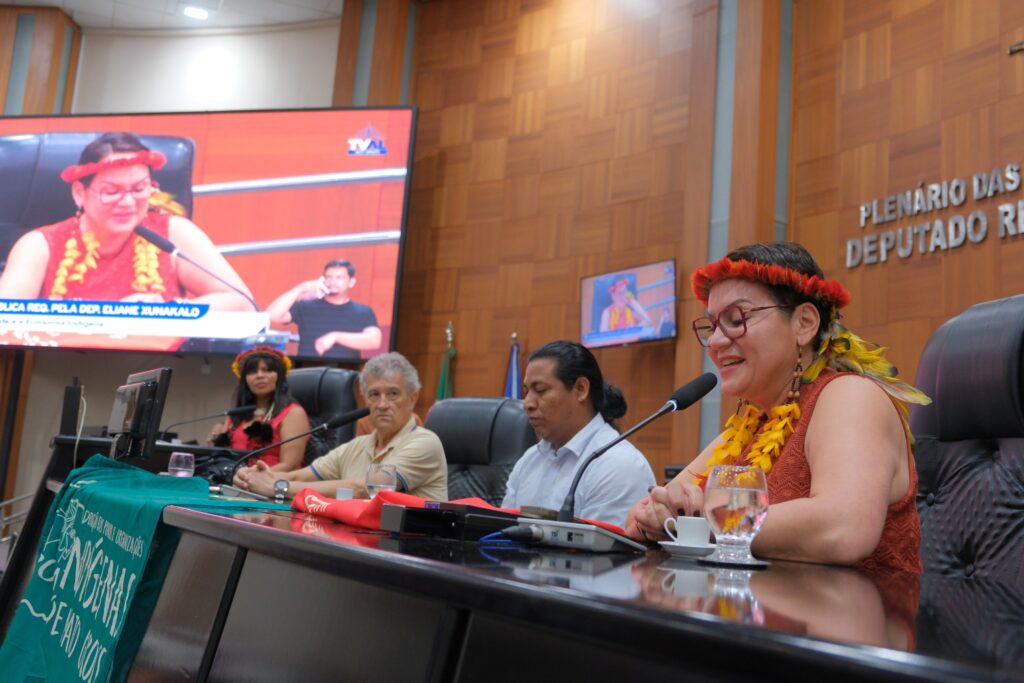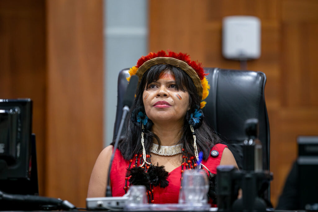 “Estamos muito felizes e ficamos agraciados em nome do nosso povo, em nome das nossas lideranças e em nome das nossas pessoas que se foram, que não puderam estar aqui para assistir essa história”, disse a professora e líder da juventude Edna Bakairi, do povo Kurâ-Bakairi, da Terra Indígena Santana, em Nobres – mesmo território da deputada.